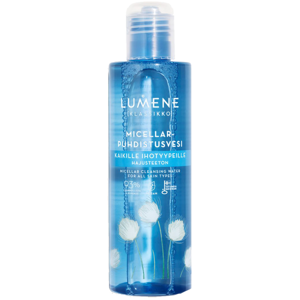 Lumene KLASSIKKO MICELLAR PUHDISTUSVESI MICELLAR CLEANSING WATER płyn micelarny skutecznie, ale łagodnie dla skóry usuwa zanieczyszczenia oraz niewodoodporny makijaż twarzy, oczu i ust. Jego formuła została wzbogacona o pielęgnacyjne składniki, które dbają o skórę podczas każdego użycia. Zawiera 93% składników pochodzenia naturalnego, jest wegański i nieperfumowany. Wyprodukowany w Finlandii, gwarantuje najwyższą jakość i skuteczność.