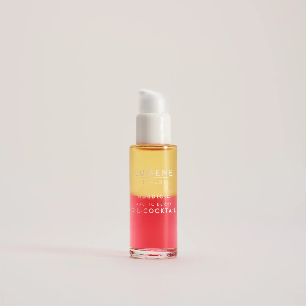 Lumene VALO NORDIC-C ARCTIC BERRY OIL – COCKTAIL rozświetlający koktajl multiwitaminowy do cery normalnej i suchej. Unikalny dwufazowy koktajl witaminowy, który odżywi nawet najbardziej przesuszoną skórę. Łączy w sobie bogate w witaminy C, B3, B5 i kwasy tłuszczowe omega, odmładzające oleje z nasion arktycznej maliny moroszki i arktycznej żurawiny z najczystszą na świecie arktyczną wodą źródlaną. Sprawia, że skóra staje się doskonale nawodniona, wygładzona i promienna.
